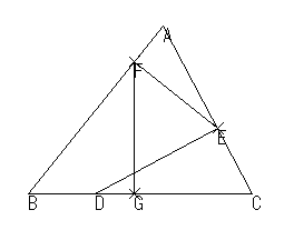 (1)ΔABCがある。 (2)辺BC上に点Dをとり,点Dから辺ACに垂線を引き,垂線と辺ACとの交点をEとおく。 (3)点Eから辺ABに垂線を引き,垂線と辺ABとの交点をFとおく。 (4)点Fから辺BCに垂線を引き,垂線と辺BCとの交点をGとおく。 このとき,点Dが辺BC上を動くとき,どんなことがいえますか。
