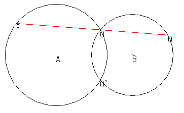 2円で交わる円A,Bがある。交点の一方をOとするとき,点Oを通る直線が図のように円A,Bと,それぞれP,Qで交わっている。このとき,直線の引き方によって線分PQの長さは変わるだろうか。