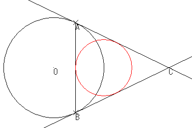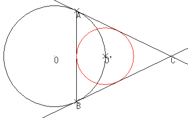 | 与えられた円O上の2つの点A,Bにおける接点の交点をCとする。このとき,ΔABCの内接円O'の中心についてどのようなことがいえるだろうか。