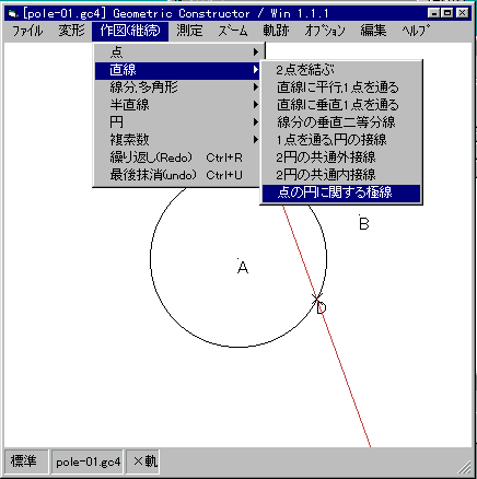 この点の円に関する極線があります。 点を動かすと,極線は消えてしまう。 消えないようにするには,どうしたらいいでしょう。