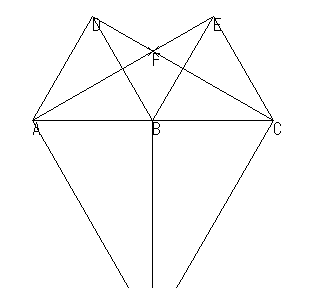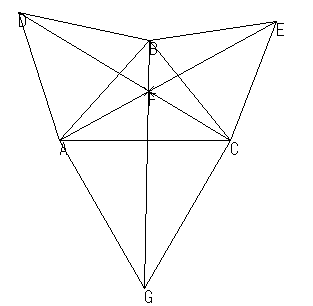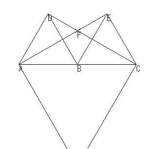 辺AC上に点Bを取る。AB と BC をそれぞれ一辺とする正三角形 ABD と BCE を線分 AC に対して, 同じ側に作る。 そして, DC と AE の交点を F とする。
