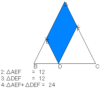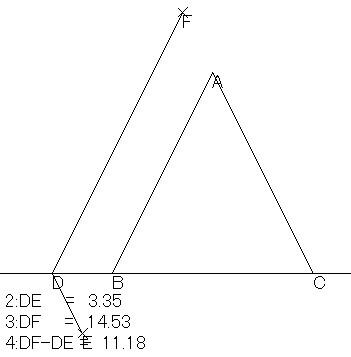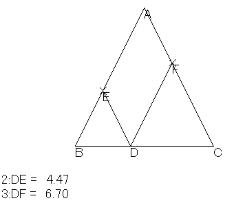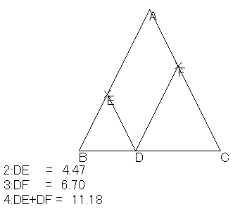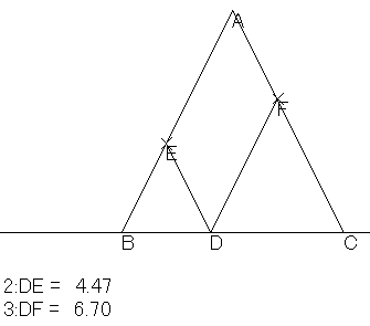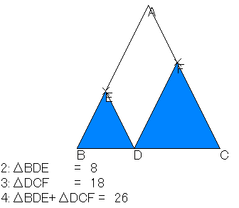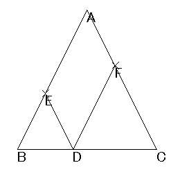 二等辺三角形ABCの底辺 BC 上に点 D を取る。 そして,点 D を通り, AC,AB に平行な直線を引き,それぞれの直線と線分 AB,AC との交点を E,F とする。