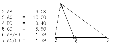 頂角の二等分線との交点が D となっている場合に,どういう関係が成立しているのかを,考えてみます。すると,次のような関係があります。