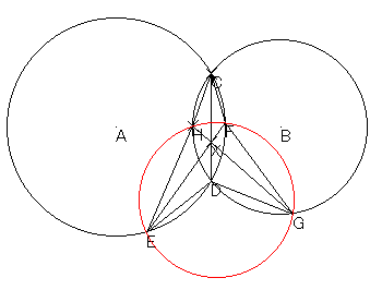 交わる2つの円がある。それぞれの円の一つずつの弦と交点を結ぶ弦が共点であるとき,二つの弦は同一円周上にある。