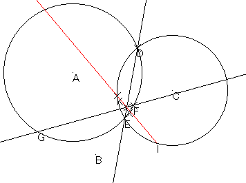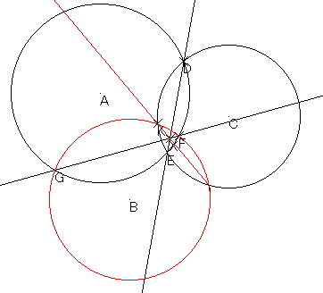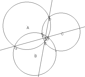 それぞれの2つずつの円に注目し,交点を通る直線を引いてみるとそれらの3つの直線が一点で交わることを証明せよ。