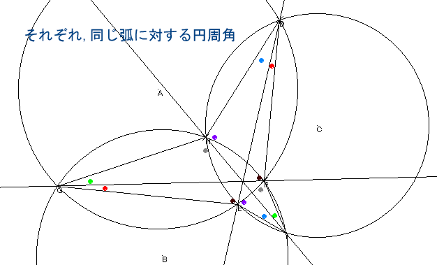 ただ,それを基に,角度で証明に持って行こうとすると,なかなかうまくいかないように思える。(うまく証明までたどりつけたら,教えてね)