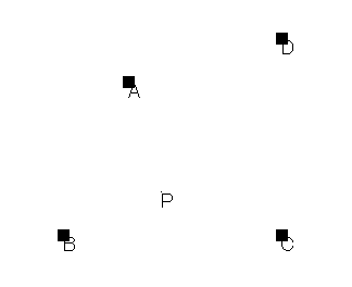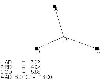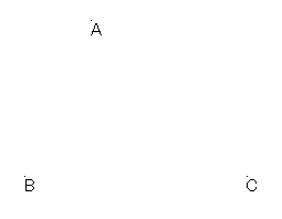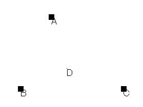 - こうして得られる答えは,どんな場合にも通用しそうなのだが,実は,A,B,Cの位置によっては,かえってよくない場所を選択してしまうこともあるらしい。A,B,Cがどういう位置にあるときには,よくない結果がでてしまうのだろうか。A,B,Cの位置も動かしながら調べてほしい。
