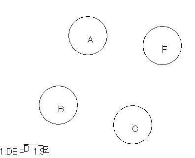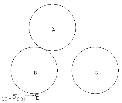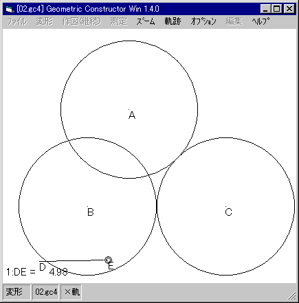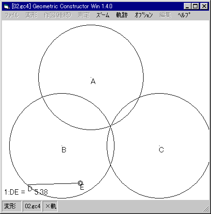 それぞれの拠点を中心に,「開墾」をしたとする。開墾の速度が同じだとすると,3人の領地はどうなるか。点Eを動かして,それぞれの半径を変えてみよう。
