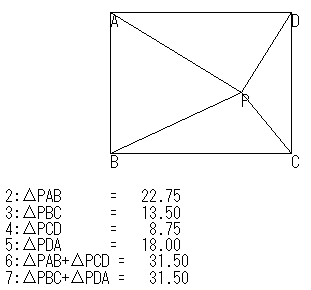 点Pが内部から外部に移動すると,「和」としての等式は成り立たなくなる。しかし,大きい方から小さい方を引いた値としての「差」に注目すると,成り立つようになる。川崎市の研究(1999)では,「〜」という記号で表現されているが,「和あるいは差」として成立する式,あるいは,面積に正負を含めて考えた場合の和を考えると,「内部」のみでなく,「どの点でも」成立すると解釈することができる。