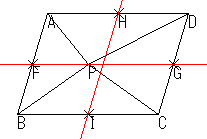 実は,これは作図ツールの性格上,仕方がないことなのだが,「異なる2点」を通るものとして,直線を作図しているのだが,ここでは「2点が重複してしまった」から「消えてしまっている」。むしろ,「2点を通る直線」は,「1点を通る直線」で十分なため,対角線の交点を通るすべての直線上の点,つまり平面上の点すべてで成立することを意味する。