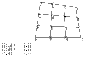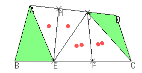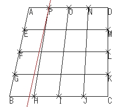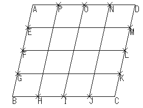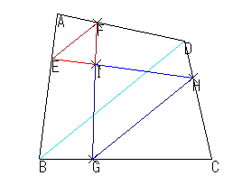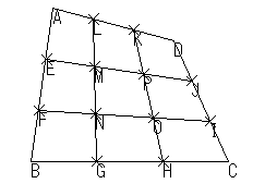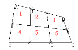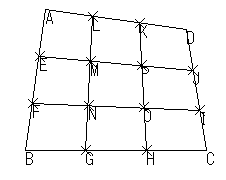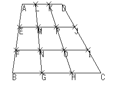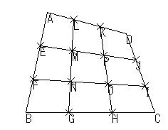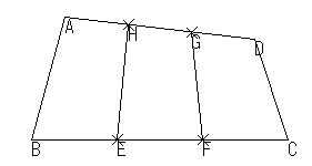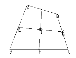 なぜかというと,平行四辺形の場合と,台形(次図)の場合には,平行線と比の関係で,簡単に(2)が証明できるのだが,その証明は,平行性が一つもない一般の四角形の場合には成立しないからである。