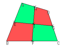 Aに関しては,上図に示されるような面積の相等関係がある。両端の(緑色の二つの)三角形と中央の四角形の綿製が等しいことが証明できればいいのだが,私には見つからなかった。