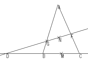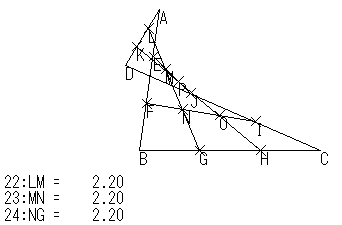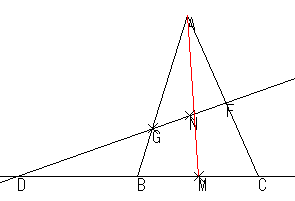 底辺BCの中点Mに対して,BCと平行な直線によってAB,ACの交点の中点を求めれば,AM上になるが,BCに平行でない直線との交点の中点ではうまくいかないのではないかと思ったのである。そして,(結果としては,3線分の延長が1点で交わるとすると)うまくいかないことの証明も作ってみた。さらに,このある意味では誤った方向性を別の方向に発展させ,別のことも見つかった。