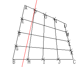台形の場合は,平行な方向に関しては,高さが共通となり,底辺がそれぞれ同じ長さとなるので,面積は等しい。そうでない方向に関しては,図のような補助線を引くと,等差数列となることが分かる。