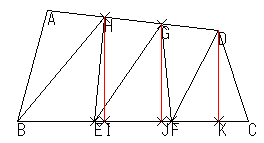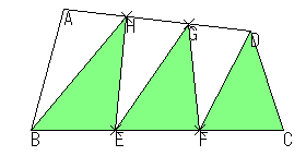 ここで,上の辺は3等分されているので,そこから同一の直線に下ろした垂線の足も等しい距離をなすことになる。