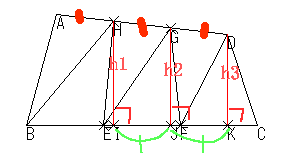 しかも,底辺の長さは等しい。そのため,それぞれの三角形の高さを h1, h2, h3 とすると,