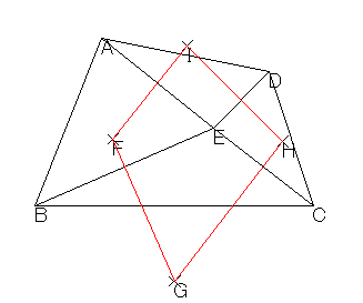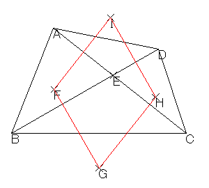 四角形ABCDの対角線を引き,その交点をEとする。こうしてできる4つの三角形の外心をそれぞれF,G,H,Iとし,四角形FGHIを作る。
