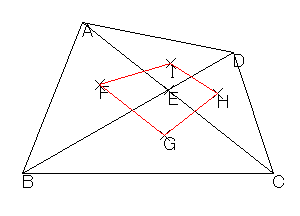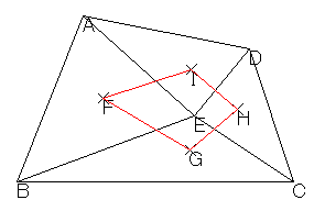 四角形ABCDの対角線を引き,その交点をEとする。こうしてできる4つの三角形の内心をそれぞれF,G,H,Iとし,四角形FGHIを作る。