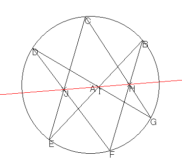 上は円だが,一般に,二次曲線の上に6つの点を取り,それぞれ上の図のように結ぶ。すると,3つの交点は一直線上に並ぶ。