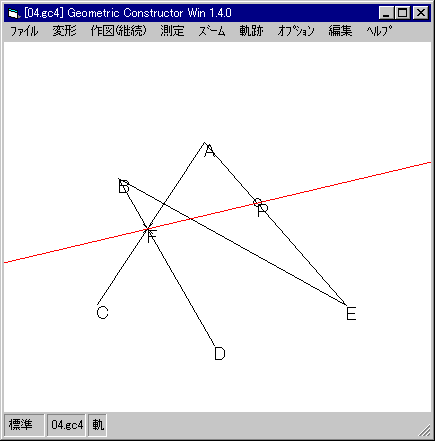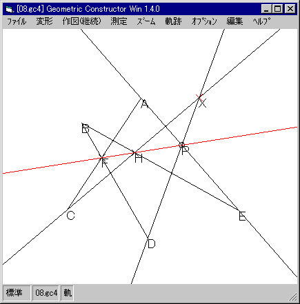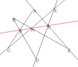 この図は,5点 A,B,C,D,E の位置を決め,点 P を直線上を動かしたときに,点 X の軌跡として,「A,B,C,D,Eを通るただ一つの」2次曲線を描く図である。