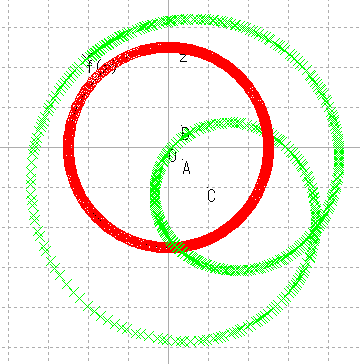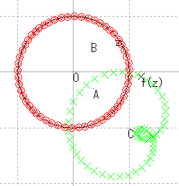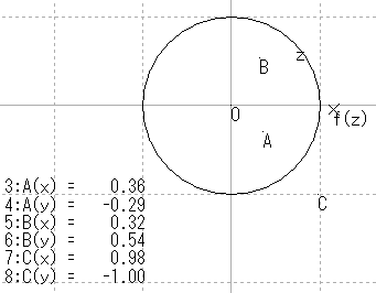 A,B,Cの実数部,虚数部がそれぞれ x,y 座標として表示されている。