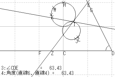 通常の角についても考えるためには,上記では,像に重なると思える円を適当に追加したが,元の角を動かしたときに,この円も動くように,きちんと作図すれば,より確証を得ることができる。円は3点が決まれば決定するので,半直線上にもう一点取り,その像を使って像の円を構成してみることにする。