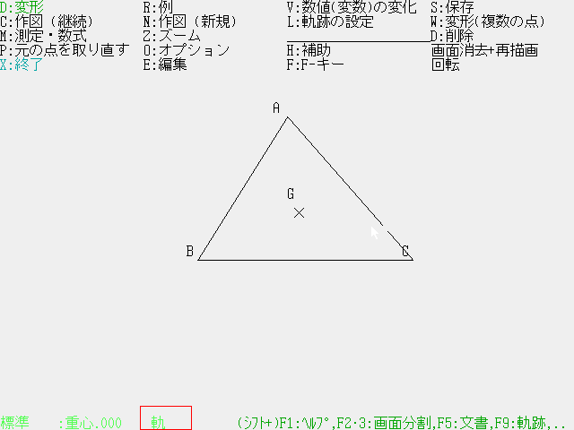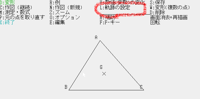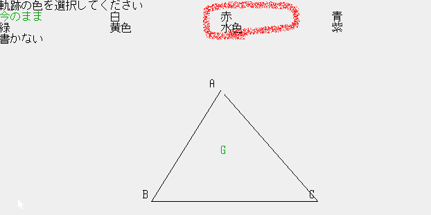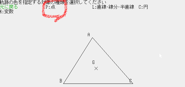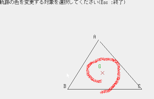 前述の図形は,事前に設定してありましたから,変形するだけで軌跡が残りました。しかし,一般には,自分で軌跡を設定する必要があります。そこで,重心の軌跡を設定することをしてみましょう。