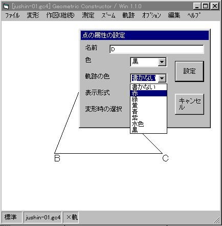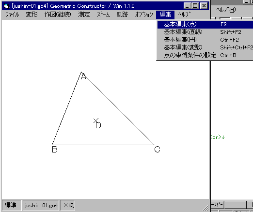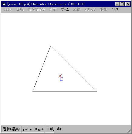 また,Windows95のDOS窓でGeometric Constructorを使う場合にも,メモリの制約はかなり大きいので,メモリ不足がしばしば現れるようでしたら,「ミニ版(機能削減版)」を使うか,Windows版を使ってください。