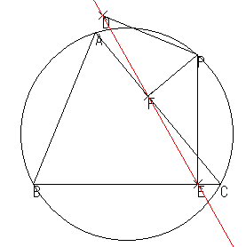 ΔABCとその外接円 O がある。円 O 上の点 P から三角形のそれぞれの辺 AB,BC,CA あるいはその延長線上に下ろした垂線の足を D,E,F とするとき,この 3 点は一直線上にある。