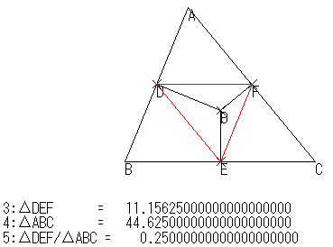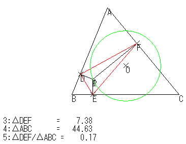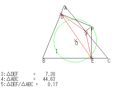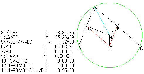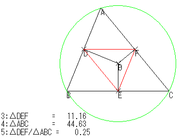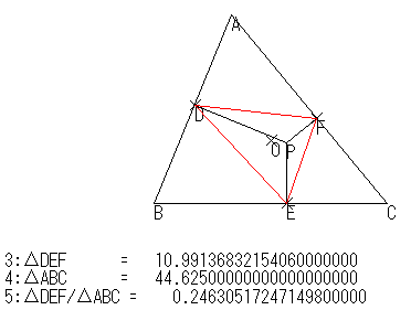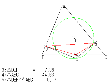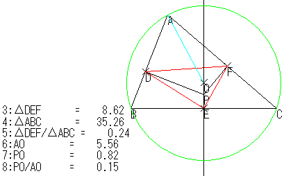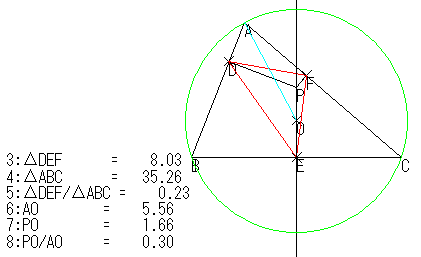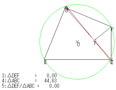 すると,次の図にも代表されるように,Aをどこにとってもこの「0.25」という値は保持されます。これによって,「ΔDEFが最大になるのは P が外心のときだ」と実感しました。
