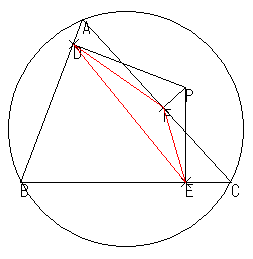ΔABCの外心Oを中心とする円C上に点Pをとり,それぞれの辺(およびその延長)に下ろした垂線の足をそれぞれ D,E,F とすると,ΔDEFの面積は一定である。