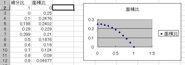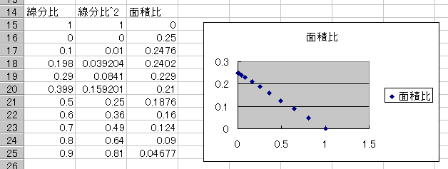 まず,「面積最大」=「面積比 = 0.25」が確かかどうかを確認しました。