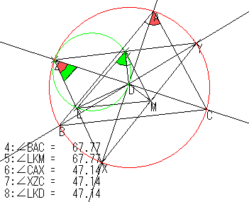 次の図が示すように,円周角の定理を2回繰り返し,また同様のもう一つの角の対応との和によって,上記が示される。